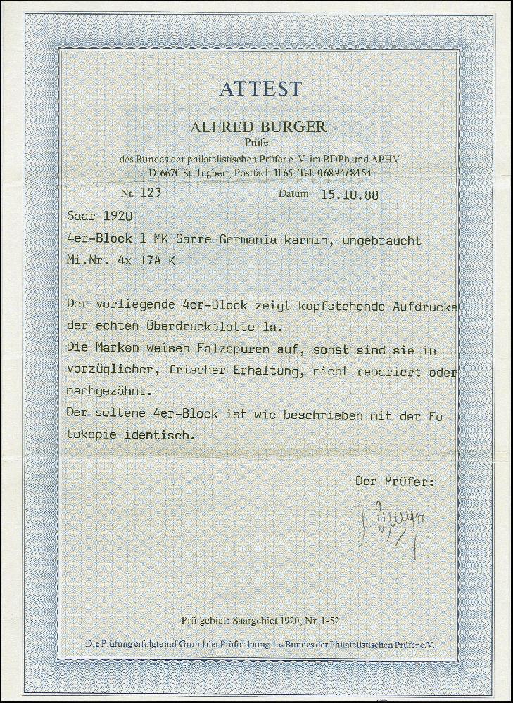 | Prüfer: | Burger, Alfred (BPP (Bund Philatelistischer Prüfer)) |