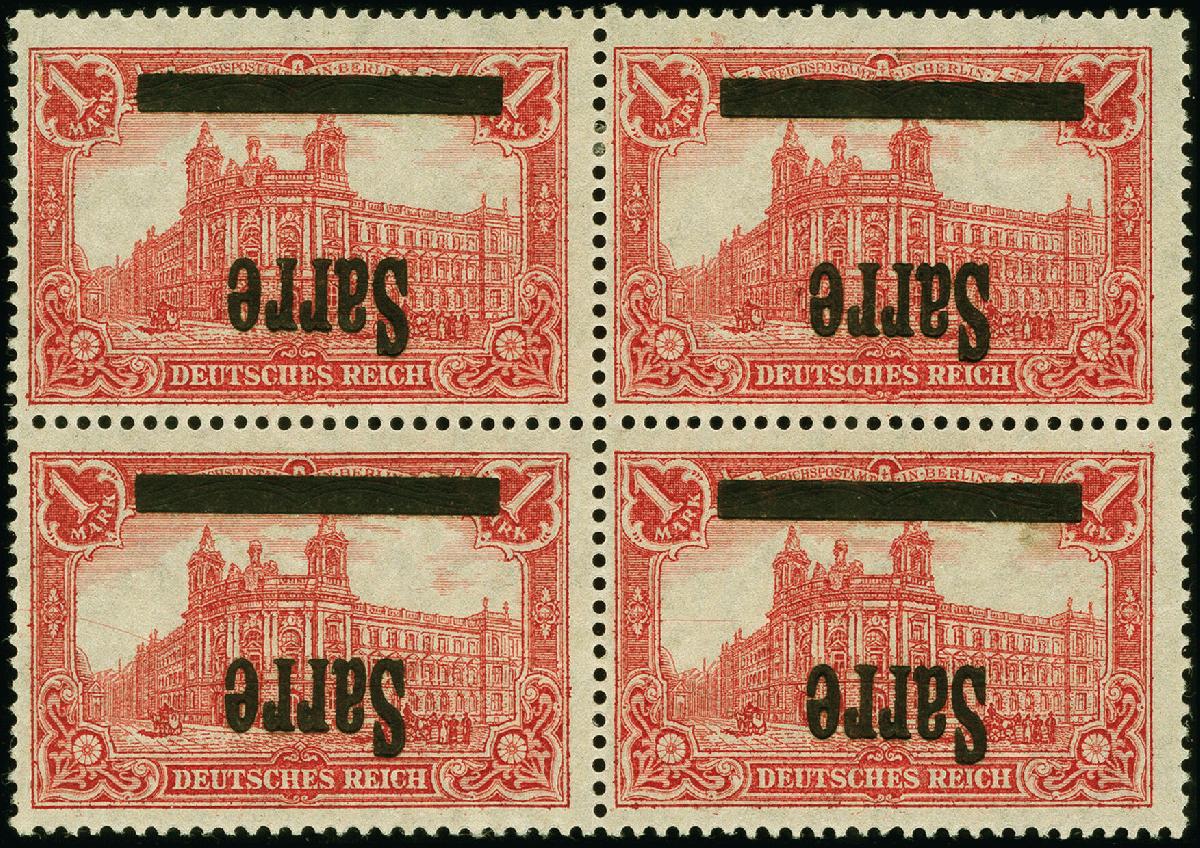| Zusatzinformationen und Suchstichworte: | 383. Auktion Heinrich Köhler 14.–15. & 18.–23. März 2024 Los 7550 Saar 1920, 1 Mark, Zähnungslöcher 25:17" mit kopfstehendem Aufdruck in Type I im Viererblock, ungebraucht, rechte untere Marke mit kleinem Fleck bildseitig, sonst in einwandfreier Erhaltung Ausruf 400,00 EUR |