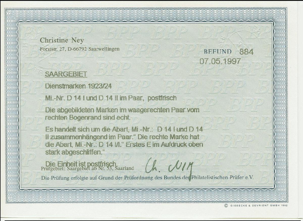 | Prüfer: | Ney, Christine (BPP (Bund Philatelistischer Prüfer)) |