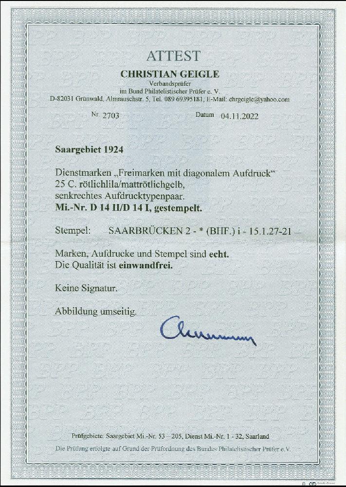 | Prüfgebiet: | Saargebiet Dienstmarken |