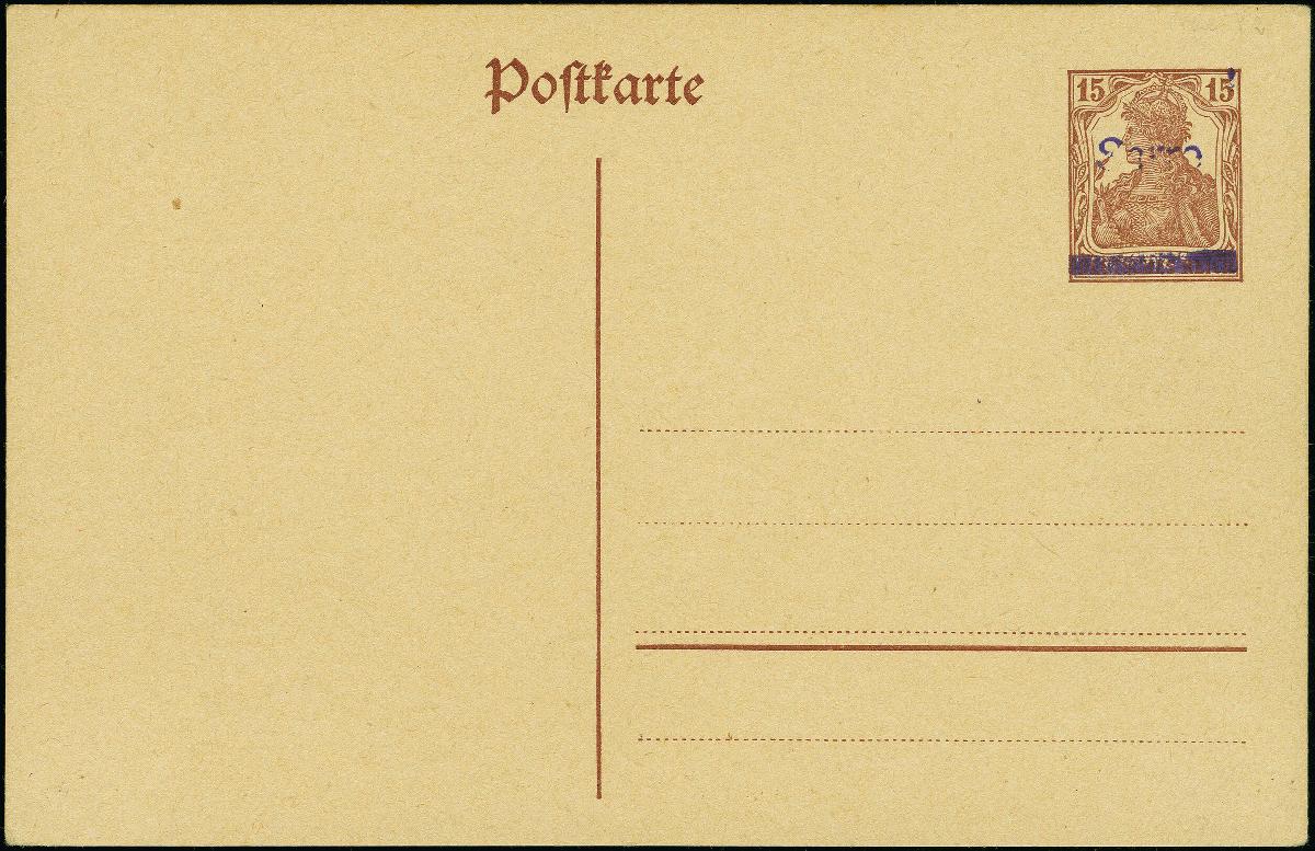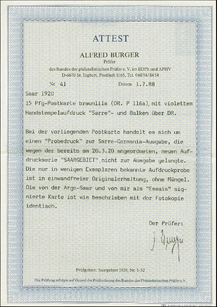 | Zusatzinformationen und Suchstichworte: | 383. Auktion Heinrich Köhler 14.–15. & 18.–23. März 2024 Los 7562 Saargebiet 1920, Ganzsachenkarte Germania 15 Pfennig mit violettem Handstempel "Sarre" mit Balken als Probedruck, ungebraucht, in guter Erhaltung, bisher sind nur wenige Exemplare bekannt Ausruf 150,00 EUR |