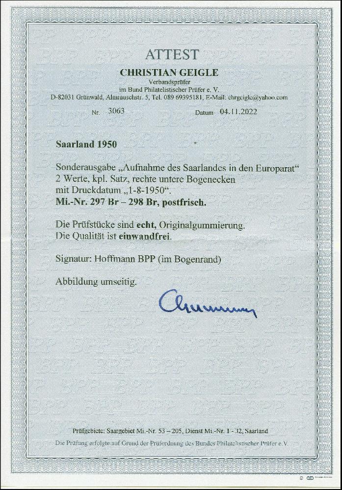 | Prüfgebiet: | Saarland (ab Mi-Nr. 206) |