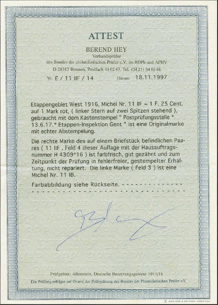 | Prüfer: | Hey, Berend (BPP (Bund Philatelistischer Prüfer)) |