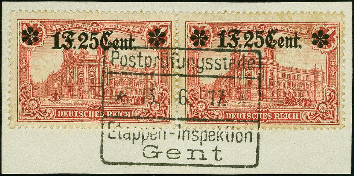 | Zusatzinformationen und Suchstichworte: | 383. Auktion Heinrich Köhler 14.–15. & 18.–23. März 2024 Los 7519 Deutsche Besetzung I. WK Etappengebiet West 1916, 1 F.25 Cent auf 1 Mark mit Aufdruckfehler "linker Stern auf Spitzen stehend" (gedrehter Stern)" (Feld 4, Teilauflage) im waagerechten Paar mit Normmarke, sauber mit Rahmenstempel "Postprüfungsstelle 13.6.17" auf Briefstück in einwandfreier Erhaltung Ausruf 100,00 EUR |