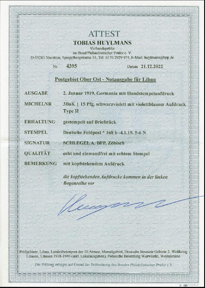 | Prüfgebiet: | Deutsche Besetzung WK 1 Postgebiet Ober Ost Libau |