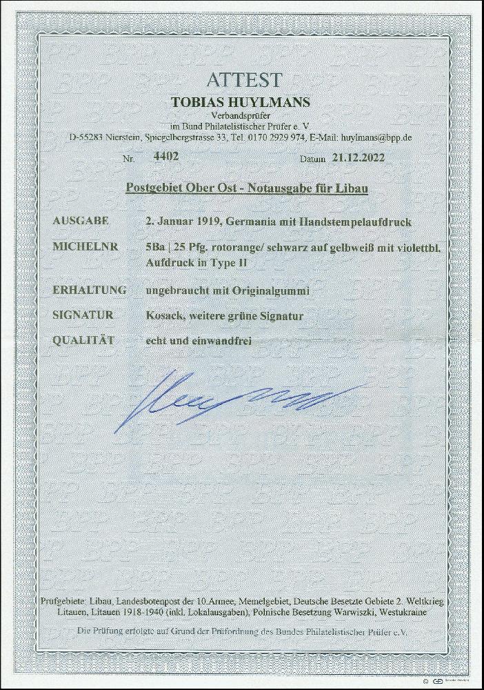 | Prüfgebiet: | Deutsche Besetzung WK 1 Postgebiet Ober Ost Libau |