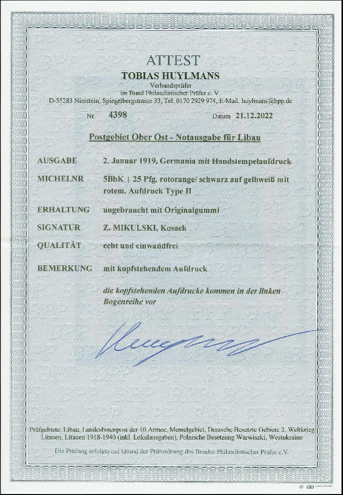 | Prüfgebiet: | Deutsche Besetzung WK 1 Postgebiet Ober Ost Libau |