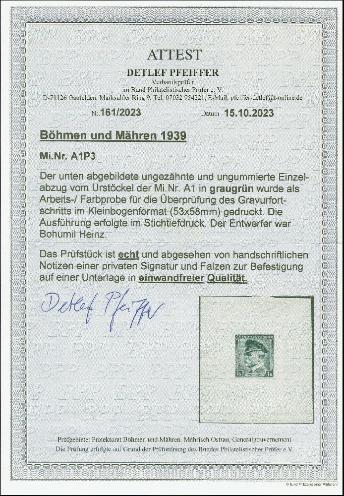 | Zusatzinformationen und Suchstichworte: | 383. Auktion Heinrich Köhler 14.–15. & 18.–23. März 2024 Los 2931 Böhmen und Mähren 1939, Masaryk 1 K. graugrün, Einzelabzug vom Urstöckel auf ungummiertem Papier (53x58mm), tadellos, rückseitig leichte Bleistiftvermerk Ausruf 250,00 EUR |