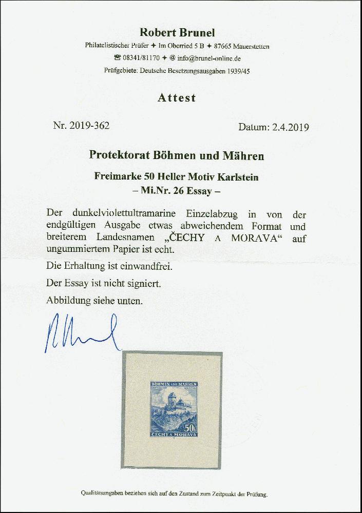 | Zusatzinformationen und Suchstichworte: | 383. Auktion Heinrich Köhler 14.–15. & 18.–23. März 2024 Los 2938 Böhmen und Mähren 1939, Burg Karlstein 50H. dunkelviolettultramarin, Einzelabzug in von der endgültigen Ausgabe etwas abweichendem Format, der Landesname "ČECHY A MORAVA" etwas breiter, auf ungummiertem Papier, tadellos, selten Ausruf 500,00 EUR |