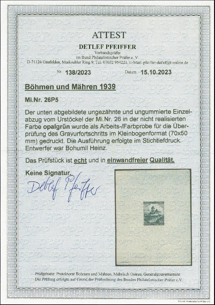 | Zusatzinformationen und Suchstichworte: | 383. Auktion Heinrich Köhler 14.–15. & 18.–23. März 2024 Los 2945 Böhmen und Mähren 1939, Burg Karlstein 50H. opalgrün, Einzelabzug vom Urstöckel auf ungummiertem Papier (70x50mm), tadellos Ausruf 250,00 EUR |