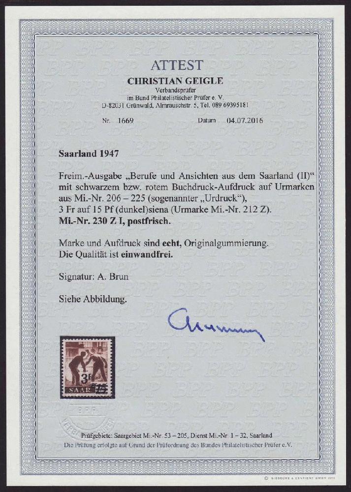 | Prüfgebiet: | Saarland (ab Mi-Nr. 206) |