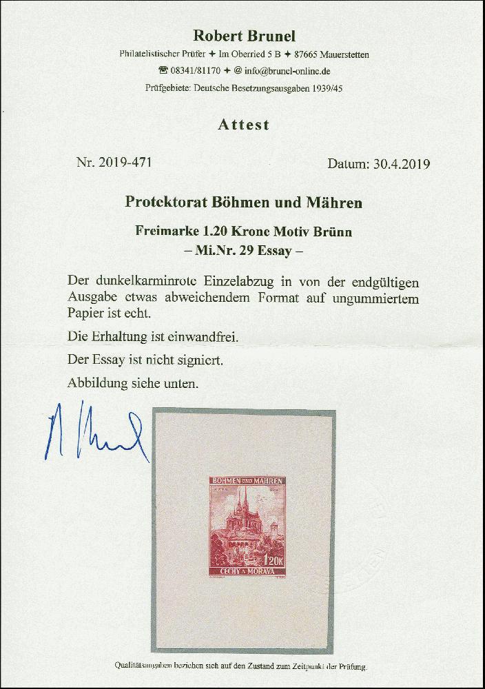 | Zusatzinformationen und Suchstichworte: | 383. Auktion Heinrich Köhler 14.–15. & 18.–23. März 2024 Los 2958 Böhmen und Mähren 1939, Landesmuseum und Turm Brünn 1,20K., dunkelkarminrot, Einzelabzug in von der endgültigen Ausgabe etwas abweichendem Format auf ungummiertem Papier, tadellos, selten Ausruf 500,00 EUR |