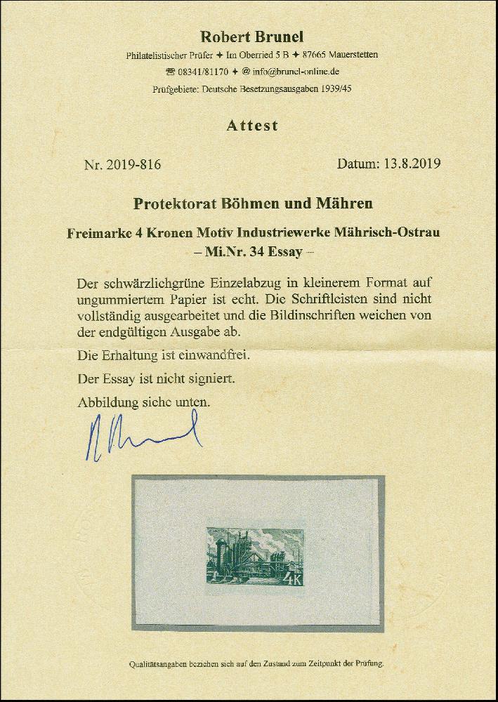 | Zusatzinformationen und Suchstichworte: | 383. Auktion Heinrich Köhler 14.–15. & 18.–23. März 2024 Los 2970 Böhmen und Mähren 1939, Industriewerke Mährisch-Ostrau 4K. schwärzlichgrün, Einzelabzug in von der endgültigen Ausgabe etwas abweichendem Format, die untere Schriftleiste nicht vollständig ausgearbeitet, und die Bildinschriften weichen von der endgültigen Ausgabe ab, auf ungummiertem Papier, tadellos, selten Ausruf 500,00 EUR |
