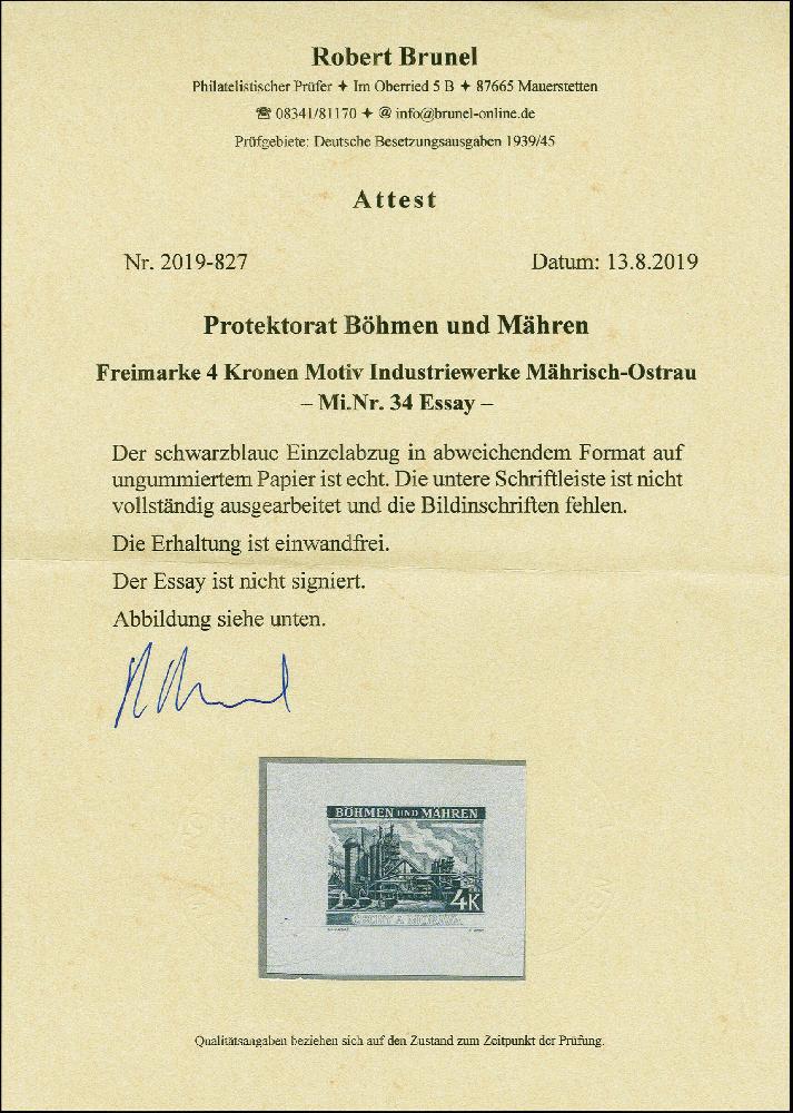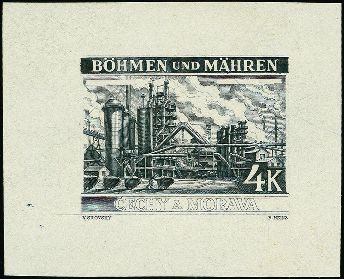 | Zusatzinformationen und Suchstichworte: | 383. Auktion Heinrich Köhler 14.–15. & 18.–23. März 2024 Los 2971 Böhmen und Mähren 1939, Industriewerke Mährisch-Ostrau 4K. schwarzblau, Einzelabzug in von der endgültigen Ausgabe etwas abweichendem Format, die untere Schriftleiste nicht vollständig ausgearbeitet, und die Bildinschriften fehlen, auf ungummiertem Papier, tadellos, selten Ausruf 500,00 EUR |