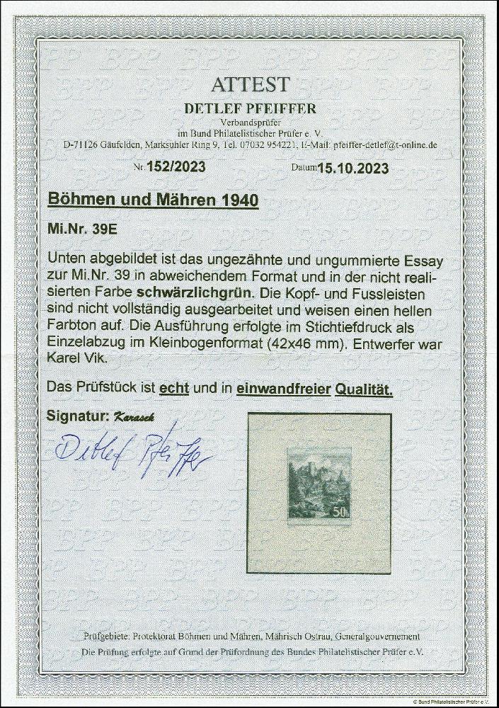 | Zusatzinformationen und Suchstichworte: | 383. Auktion Heinrich Köhler 14.–15. & 18.–23. März 2024 Los 2975 Böhmen und Mähren 1939, Neuhaus 50H. schwärzlichgrün, Einzelabzug in abweichendem Format, die Schriftleisten sind nicht vollständig ausgearbeitet und weisen einen helleren Farbton auf, auf ungummiertem Papier, tadellos, sehr selten Ausruf 500,00 EUR |