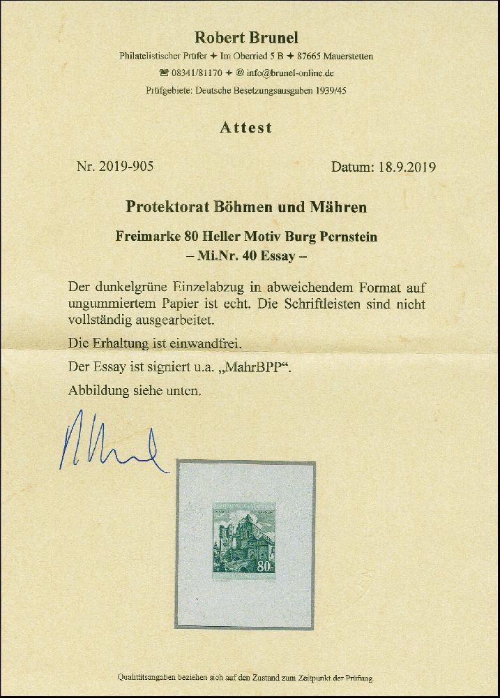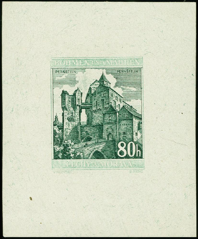 | Zusatzinformationen und Suchstichworte: | 383. Auktion Heinrich Köhler 14.–15. & 18.–23. März 2024 Los 2979 Böhmen und Mähren 1940, Burg Pernstein 80H. dunkelgrün, Einzelabzug in abweichendem Format, die Schriftleisten sind nicht vollständig ausgearbeitet und weisen einen helleren Farbton auf, auf ungummiertem Papier, tadellos, sehr selten Ausruf 500,00 EUR |