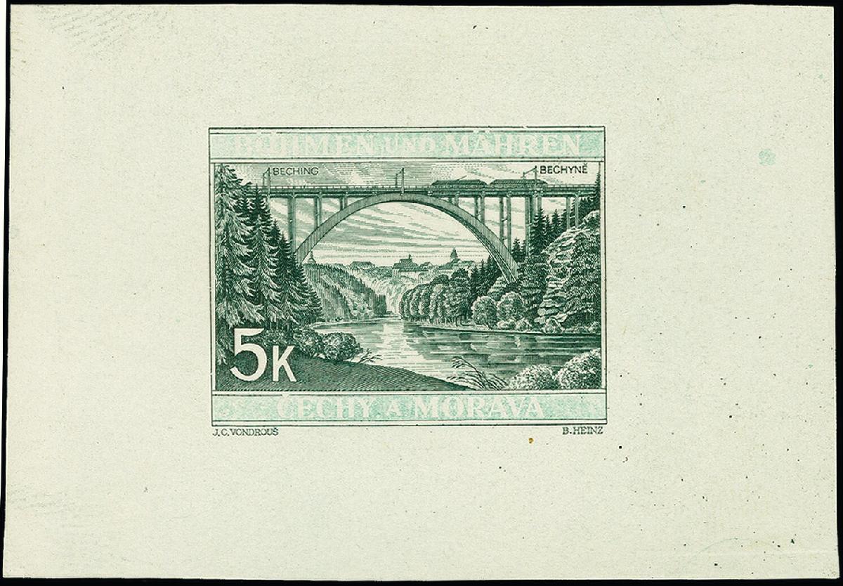| Zusatzinformationen und Suchstichworte: | 383. Auktion Heinrich Köhler 14.–15. & 18.–23. März 2024 Los 2985 Böhmen und Mähren 1940, Lainsitz-Brücke mit Bechin im Hintergrund 5K., dunkelgraugrün, Einzelabzug in abweichendem Format, die Schriftleisten sind nicht vollständig ausgearbeitet und weisen einen helleren Farbton auf, auf ungummiertem Papier, tadellos, selten Ausruf 500,00 EUR |