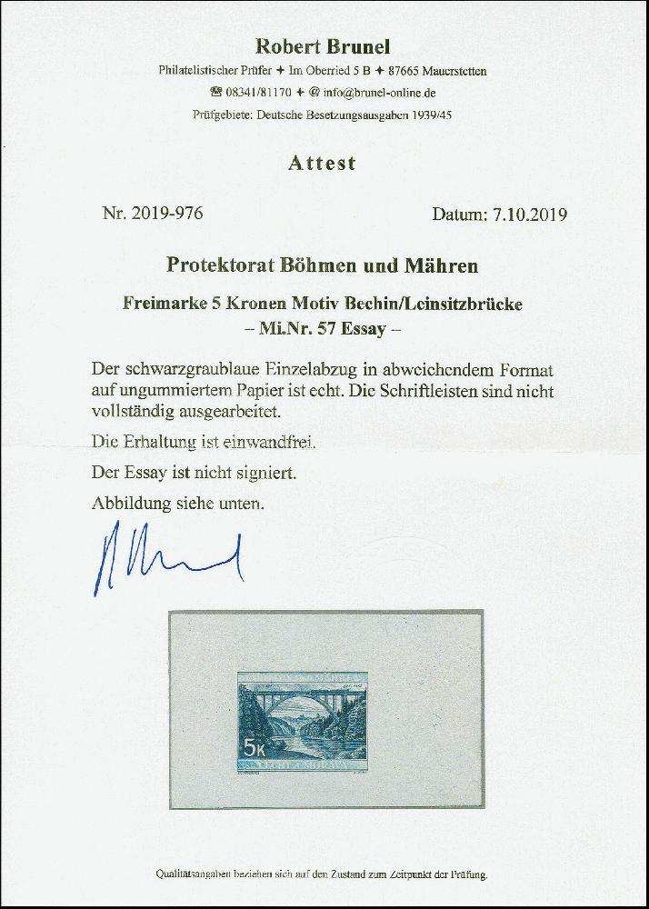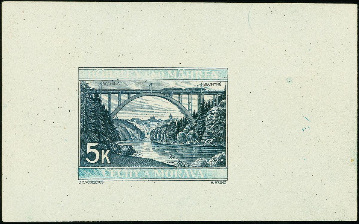 | Zusatzinformationen und Suchstichworte: | 383. Auktion Heinrich Köhler 14.–15. & 18.–23. März 2024 Los 2989 Böhmen und Mähren 1940, Lainsitz-Brücke mit Bechin im Hintergrund 5K. schwarzgraublau, Einzelabzug in abweichendem Format, die Schriftleisten sind nicht vollständig ausgearbeitet und weisen einen helleren Farbton auf, auf ungummiertem Papier, tadellos, selten Ausruf 500,00 EUR |