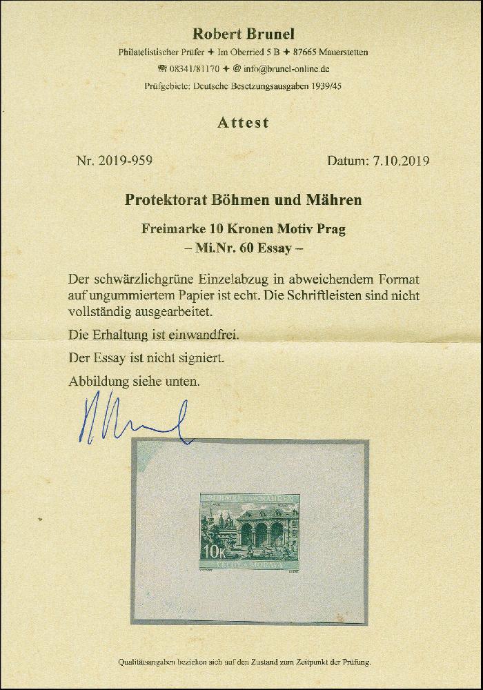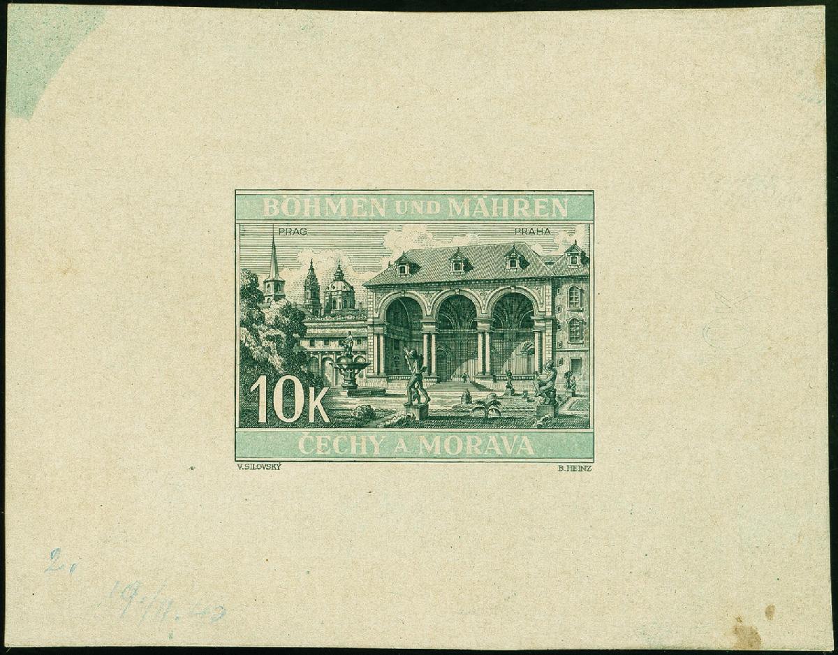 | Zusatzinformationen und Suchstichworte: | 383. Auktion Heinrich Köhler 14.–15. & 18.–23. März 2024 Los 2990 Böhmen und Mähren 1940, Waldstein-Palais Prag 10K. schwärzlichgrün, Einzelabzug in abweichendem Format, die Schriftleisten sind nicht vollständig ausgearbeitet und weisen einen helleren Farbton auf, auf ungummiertem Papier, unten links Datierung, tadellos, selten Ausruf 500,00 EUR |