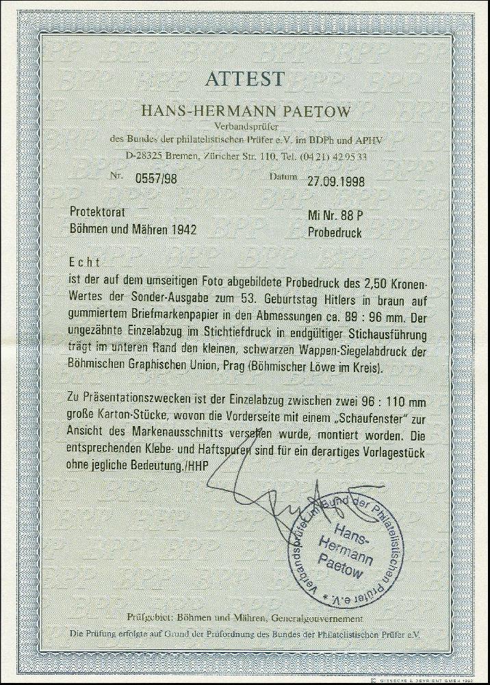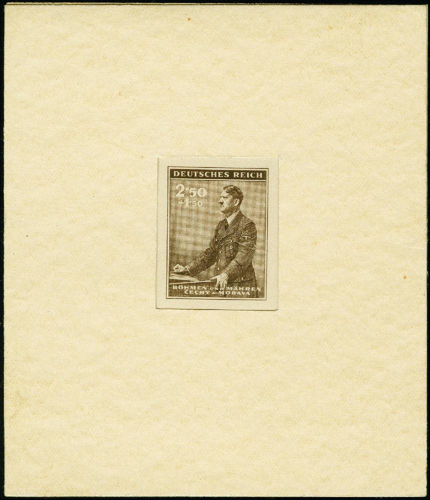 | Zusatzinformationen und Suchstichworte: | 383. Auktion Heinrich Köhler 14.–15. & 18.–23. März 2024 Los 2995 Böhmen und Mähren 1942, 53. Geburtstag von Adolf Hitler 2,50 K. braun, Einzelabzug auf gummiertem Papier im Blockformat, links mit Farbleiste, unten mit Wappensiegel der Druckerei, sauber in Passepartout montiert (bei beiden Kartonseiten getrennt), tadellos, sehr attraktiv und selten Ausruf 800,00 EUR |