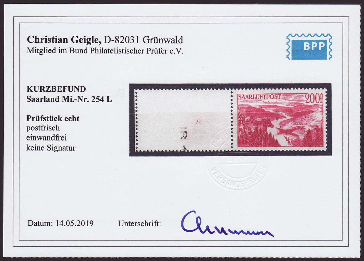 | Zusatzinformationen und Suchstichworte: | Christian E. Geigle Briefmarkenfachhandel Los 0003541954 Saarland 1948, Flugpostmarken, 200 Fr. lilarot, postfrisches Luxusstück vom linken Bogenrand mit links anhängendem Leerfeld, unsigniert mit FKB Geigle "einwandfrei". Festpreis 59,00 EUR |