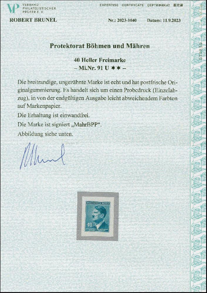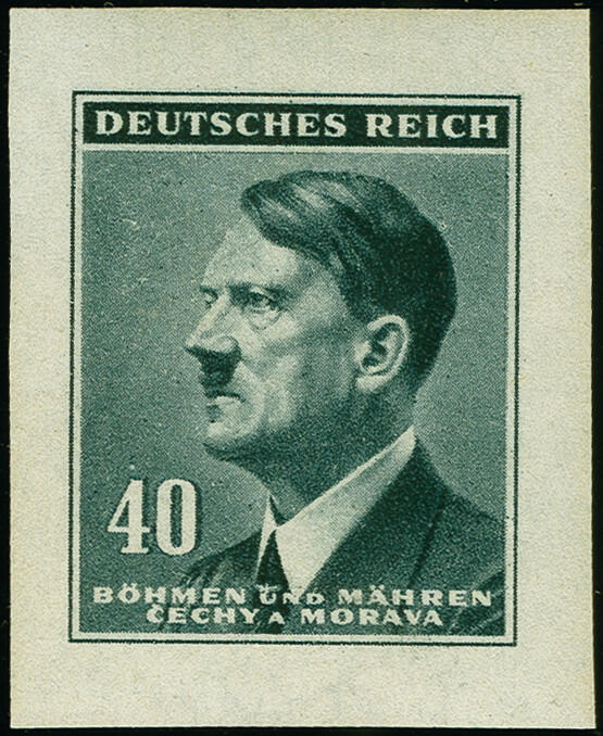 | Zusatzinformationen und Suchstichworte: | 383. Auktion Heinrich Köhler 14.–15. & 18.–23. März 2024 Los 3000 Böhmen und Mähren 1942, Hitler 40 H., allseits breitrandig ungezähnt, in von der endgültigen Ausgabe leicht abweichenden Farbton, postfrisch, tadellos Ausruf 120,00 EUR |