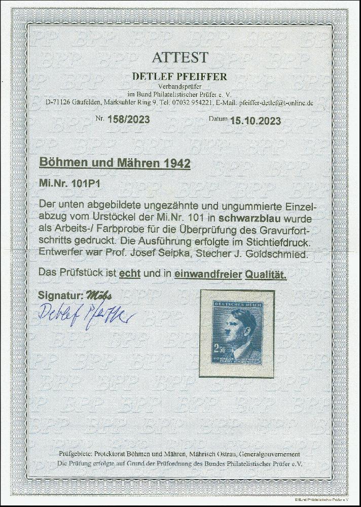 | Zusatzinformationen und Suchstichworte: | 383. Auktion Heinrich Köhler 14.–15. & 18.–23. März 2024 Los 3003 Böhmen und Mähren 1942, Hitler 2,50K. schwarzblau als Einzelabzug auf ungummiertem Papier, tadellos Ausruf 250,00 EUR |