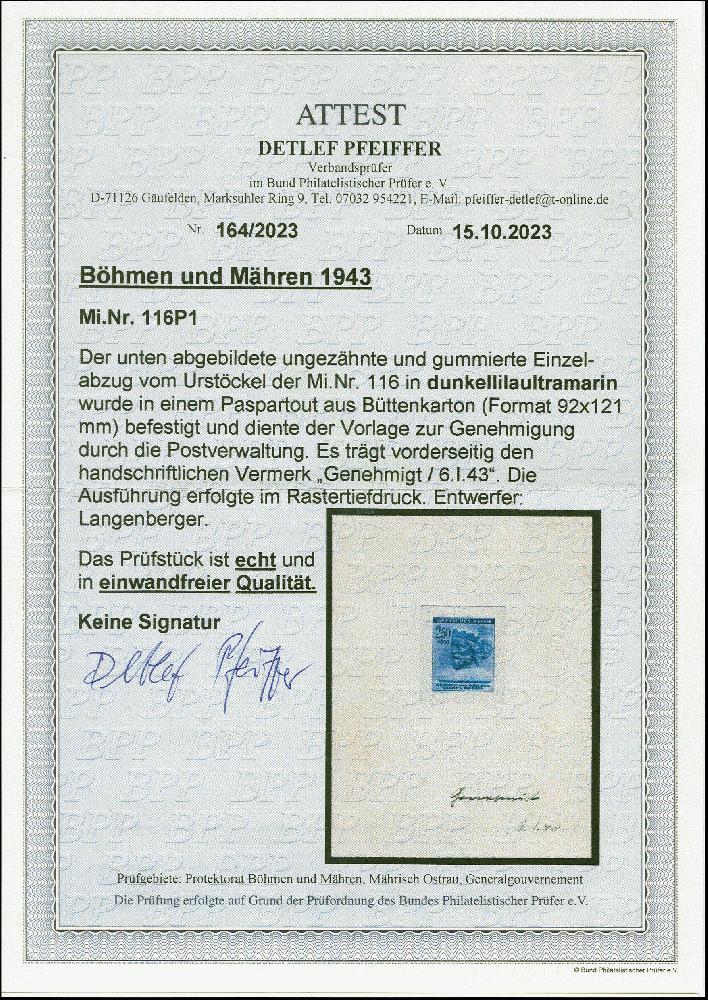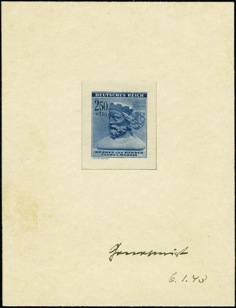 | Zusatzinformationen und Suchstichworte: | 383. Auktion Heinrich Köhler 14.–15. & 18.–23. März 2024 Los 3006 Böhmen und Mähren 1943, Winterhilfswerk 250 H. dunkellilaultramarin, Einzelabzug auf gummiertem Papier im Blockformat, sauber in Passepartout montiert, unten mit handschriftlichem Vermerk "Genehmigt 6.1.43", tadellos, sehr attraktiv und selten Ausruf 500,00 EUR |