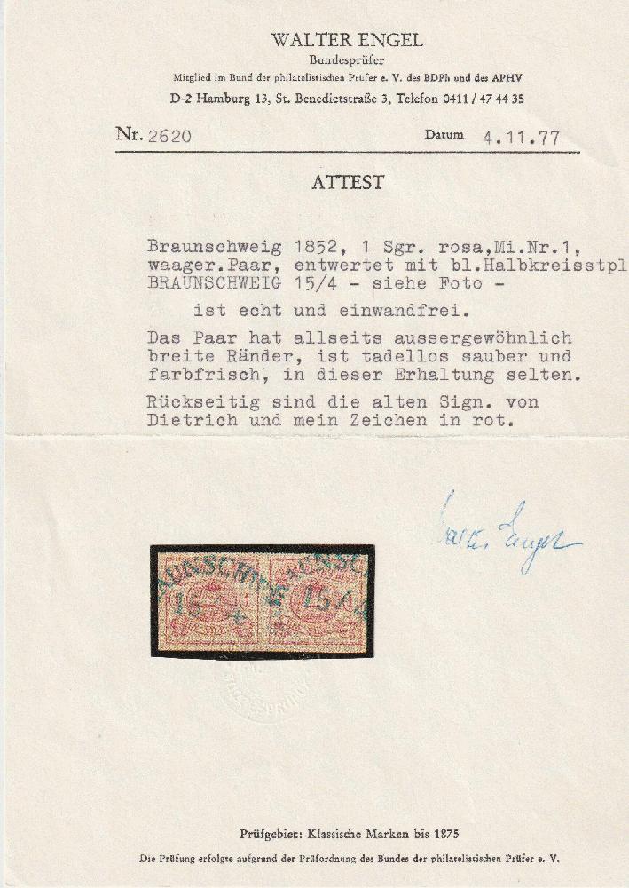 | Zusatzinformationen und Suchstichworte: | Südphila P. Feuser 101. Auktion 16. März 2024 Los 55 Altdeutschland Braunschweig 1 Sgr. lilarosa, allseits besonders breitrandiges und farbfrisches Luxuspaar mit dek. Bogenstempel BRAUNSCHWEIG, eine seltene Einheit in hervorragender Qualitä Ausruf 800,00 EUR |