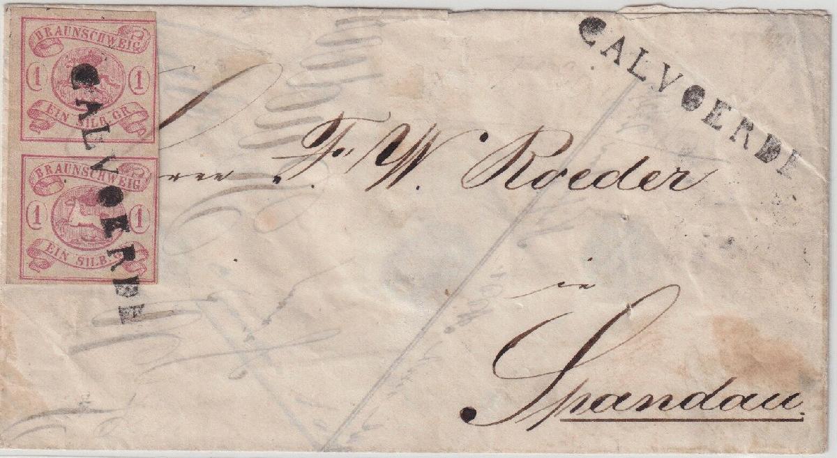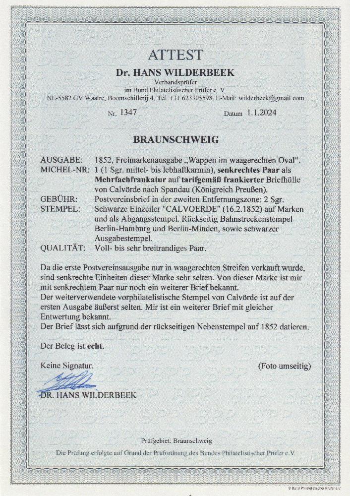 | Zusatzinformationen und Suchstichworte: | Südphila P. Feuser 101. Auktion 16. März 2024 Los 61 Altdeutschland Braunschweig 1 Sgr. lilarosa, senkr. Paar (obere Marke rechts berührt) mit sehr seltener Entwertung durch sehr spät verwendetem westphäl. L1 CALVOERDE auf Brief nach Spandau, Attest Dr. Wilderbeek: "Da die erste Postvereinsausgabe nur in waagerechte Streifen verkauft wurde, sind senkrechte Einheiten dieser Marke sehr selten. Von dieser Marke ist mir mit senkrechtem Paar nur ein weiterer Brief bekannt. Der weiterverwendete vorphilatelistische Stempel von Calvörede ist auf der ersten Ausgabe äußerst selten. Mir ist ein weiterer Brief mit gleicher Entwertung bekannt. Der Brief lässt sich aufgrund der rückseitigen Nebenstempel auf 1852 datieren." Ausruf 1.500,00 EUR |