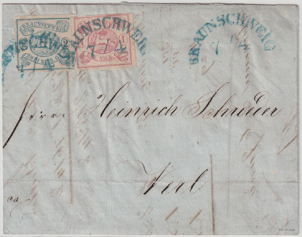 | Zusatzinformationen und Suchstichworte: | Südphila P. Feuser 101. Auktion 16. März 2024 Los 63 Altdeutschland Braunschweig 1 Sgr. lilarosa und 2 Sgr. hellblau, breitrandige Kabinettstücke als sehr seltene Frankatur mit Bogenstempel BRAUNSCHWEIG auf Brief nach Verl. Ausruf 1.200,00 EUR |