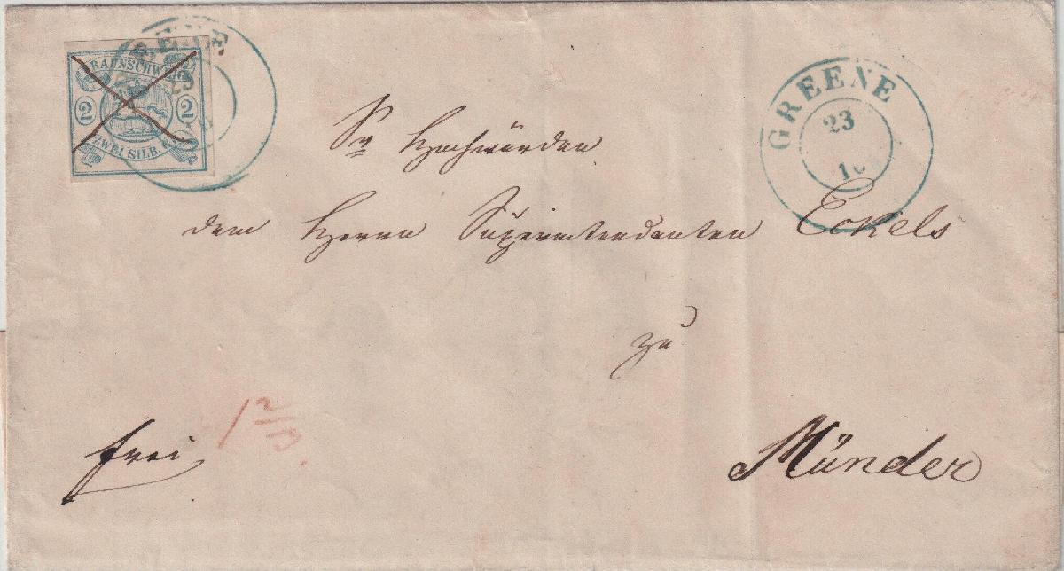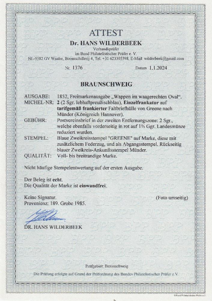 | Zusatzinformationen und Suchstichworte: | Südphila P. Feuser 101. Auktion 16. März 2024 Los 76 Altdeutschland Braunschweig 2 Sgr. blau, voll- bis breitrandig mit Federkreuz und seltenem vorphil. K2 GREENE auf Prachtbrief nach Münster Ausruf 400,00 EUR |