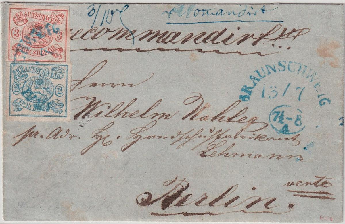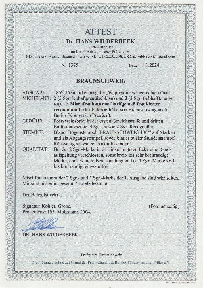 | Zusatzinformationen und Suchstichworte: | Südphila P. Feuser 101. Auktion 16. März 2024 Los 78 Altdeutschland Braunschweig 2 Sgr. blau und 3 Sgr. orangerot, je breitrandig mit Bogenstempel BRAUNSCHWEIG auf dekorativem Chargébrief nach Berlin, ganz min. Alterspuren ohne Bedeutung (2 Sgr. kl. Randspalt geschlossen), eine äußerst seltene Frankaturkombination der ersten Ausgabe (7 Briefe bekannt) Ausruf 2.000,00 EUR |