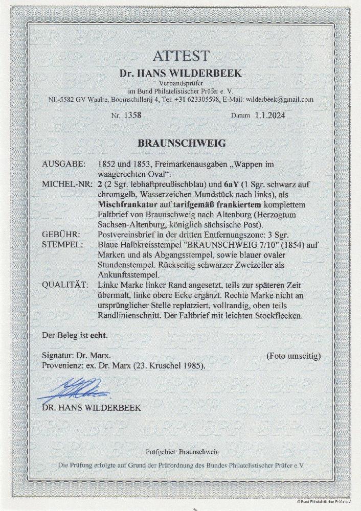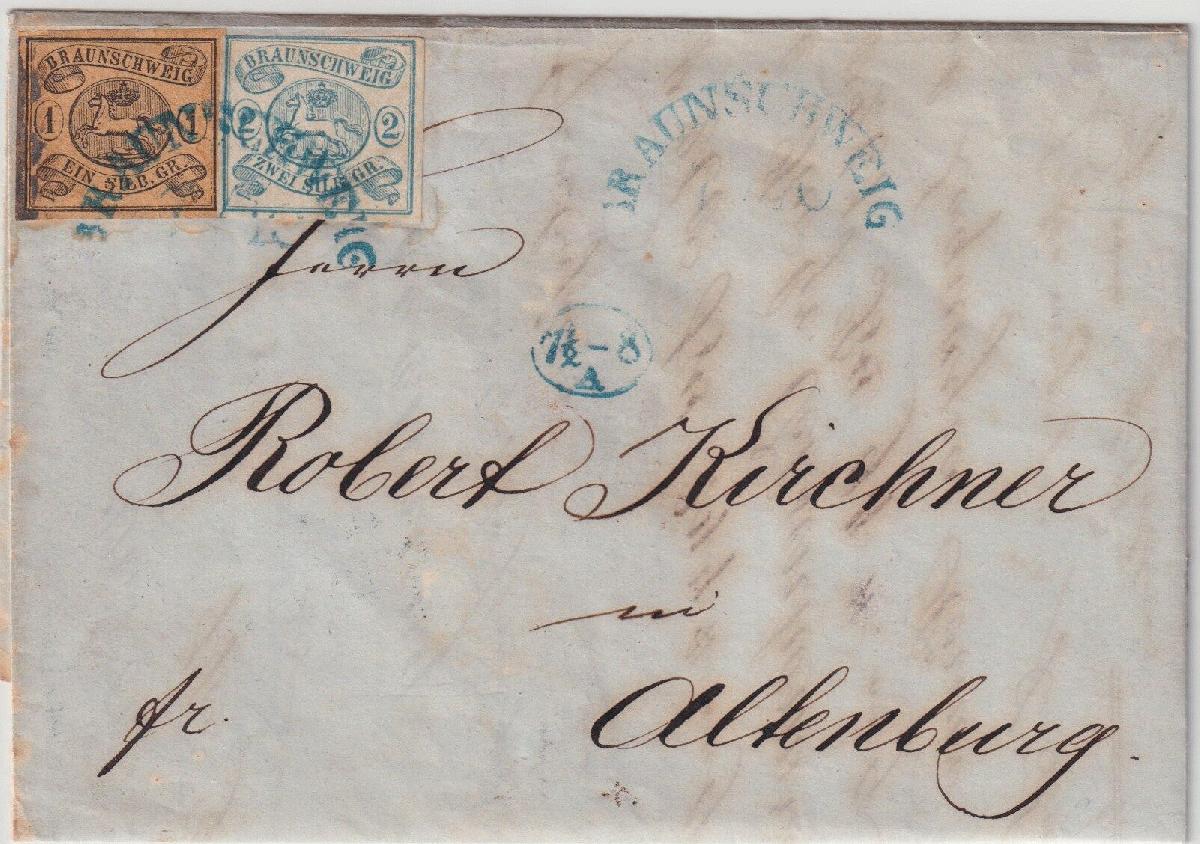 | Zusatzinformationen und Suchstichworte: | Südphila P. Feuser 101. Auktion 16. März 2024 Los 79 Altdeutschland Braunschweig 2 Sgr. blau und 1 Sgr. a. sämisch (Randreparatur, Klebespuren, Marken waren gelöst), mit Bogenstempel BRAUNSCHWEIG auf Brief nach Altenburg, eine seltene Frankatur Ausruf 400,00 EUR |