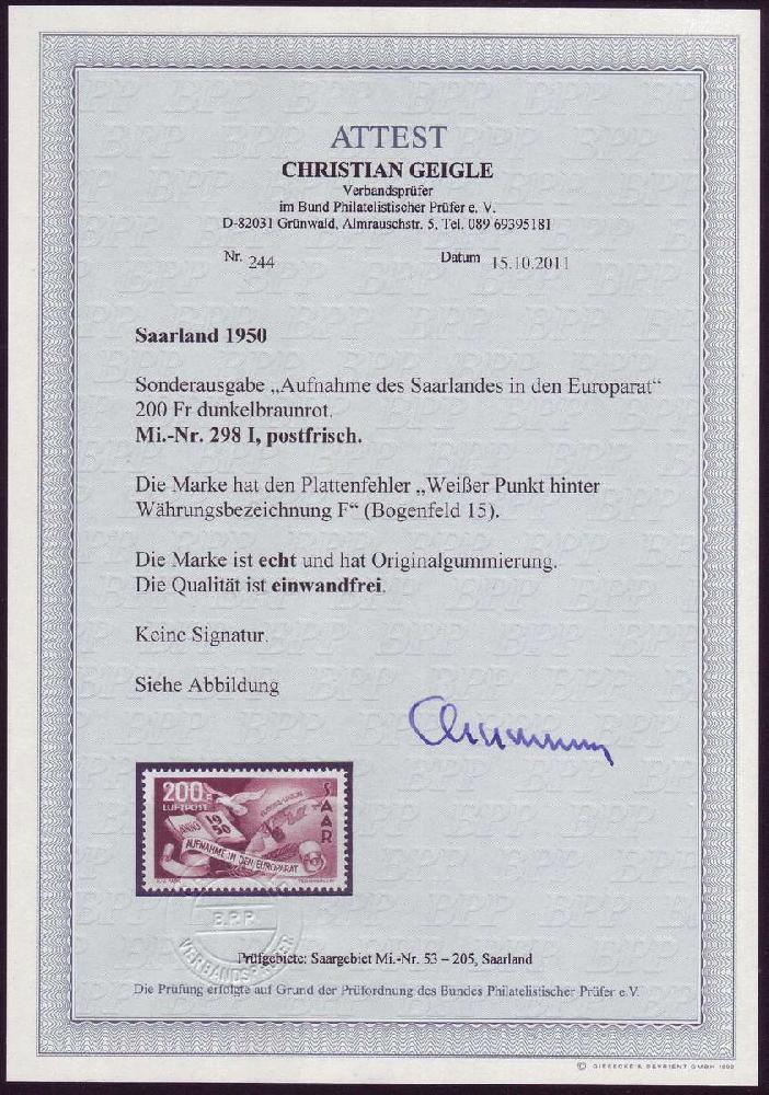 | Zusatzinformationen und Suchstichworte: | Christian E. Geigle Briefmarkenfachhandel Los 0001821756 Saarland 1950, Europarat, 200 F. dunkelbraunrot mit dem Plattenfehler I (Feld 15), postfrisches Luxusstück, unsigniert mit FA Geigle "einwandfrei". Festpreis 320,00 EUR |