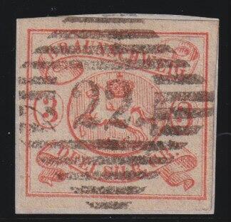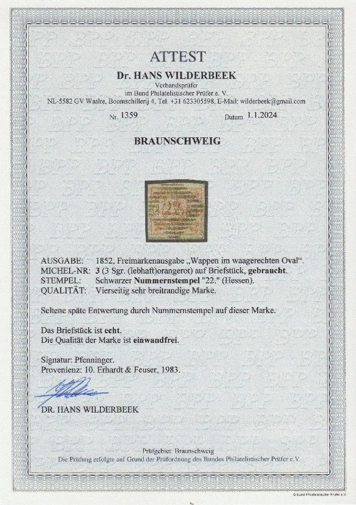 | Zusatzinformationen und Suchstichworte: | Südphila P. Feuser 101. Auktion 16. März 2024 Los 90 Altdeutschland Braunschweig 3 Sgr. orangerot, breitrandiges Luxusstück mit zentrischem Gitterstempel "22" Hessen, eine sehr seltene Entwertung Ausruf 500,00 EUR |