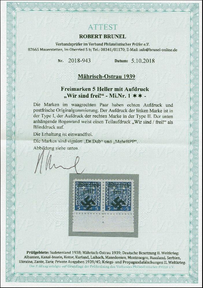 | Zusatzinformationen und Suchstichworte: | 383. Auktion Heinrich Köhler 14.–15. & 18.–23. März 2024 Los 3010 Böhmen und Mähren Mährisch-Ostrau 1939, 5 H. im waagerechten Unterrandpaar, Aufdrucktypen I und II, im Unterrand mit weiterem Teilaufdruck im Blinddruck, postfrisch, tadellos Ausruf 100,00 EUR |