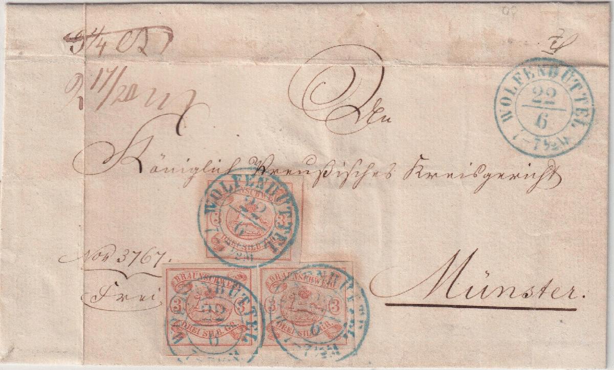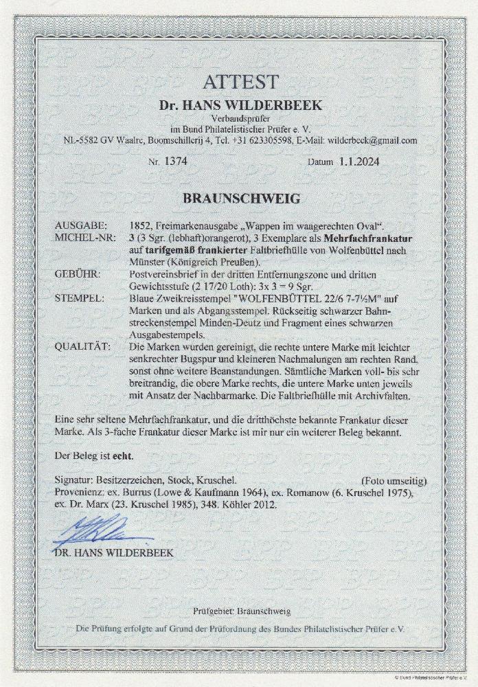 | Zusatzinformationen und Suchstichworte: | Südphila P. Feuser 101. Auktion 16. März 2024 Los 97 Altdeutschland Braunschweig 3 Sgr. orangerot, drei breitrandige Exemplare (eine Marke kl. Beanstandungen) mit K2 WOLFENBÜTTEL auf Brief der 3. Gewichtsstufe ("2 17/20 Loth", ursprünglich "3 1/4" Loth) nach Münster, der Brief wurde in alter Zeit kürzer gefaltet (ursprünglicher Zustand jetzt wieder hergestellt) und hat dadurch Falt- und Altersspuren, dennoch eine der bedeutenden Frankaturen der ersten Ausgabe Ausruf 3.000,00 EUR |