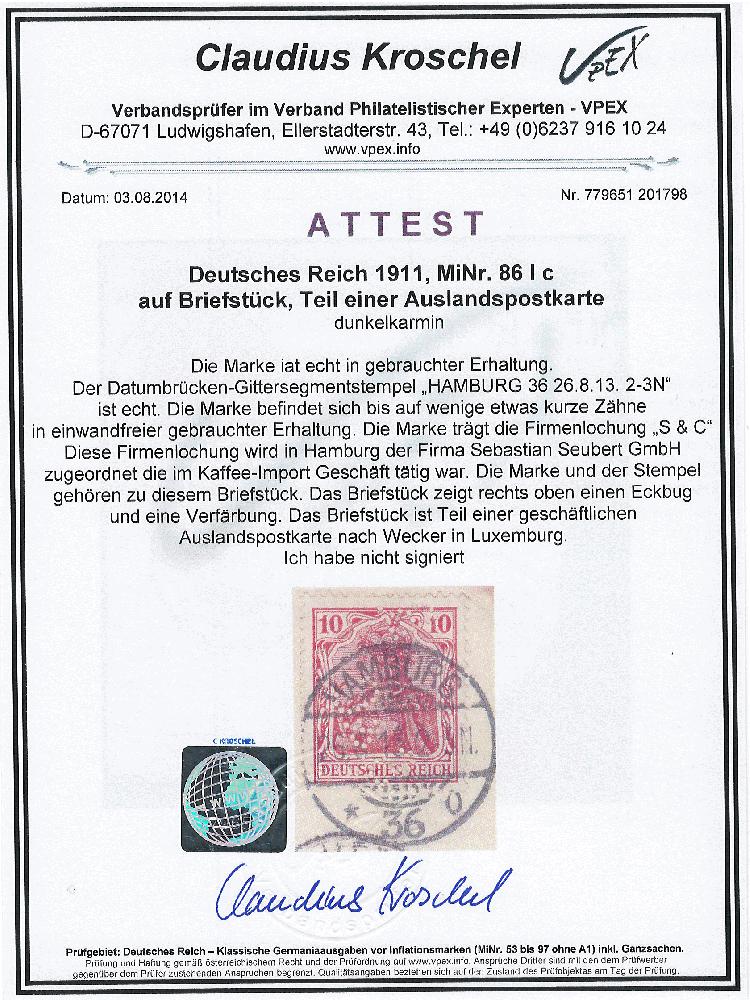 | Zusatzinformationen und Suchstichworte: | Deutsches Reich Nr.86 I c mit Firmenlochung S & C |