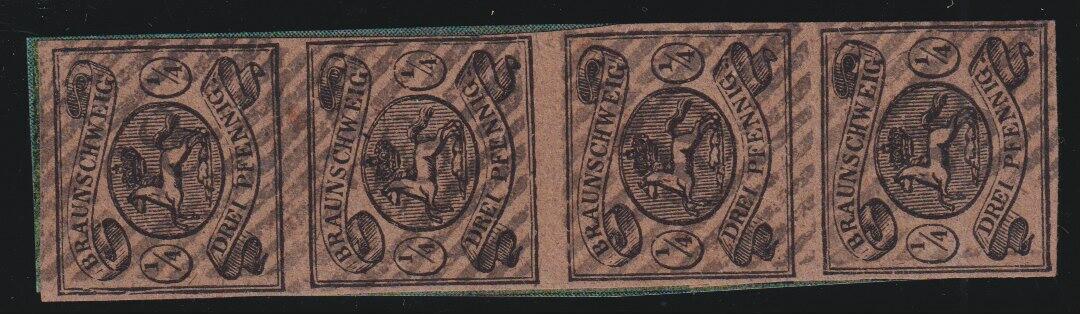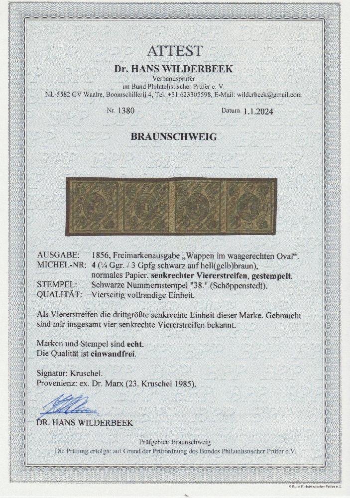 | Zusatzinformationen und Suchstichworte: | Südphila P. Feuser 101. Auktion 16. März 2024 Los 100 Altdeutschland Braunschweig 1/4 Ggr. a. hellbraun,voll- bis breitrandiges senkrechter Kabinett-Viererstreifen mit Stempel "38" Schöppenstedt, es sind nur vier senkr. Viererstreifen bekannt Ausruf 600,00 EUR |