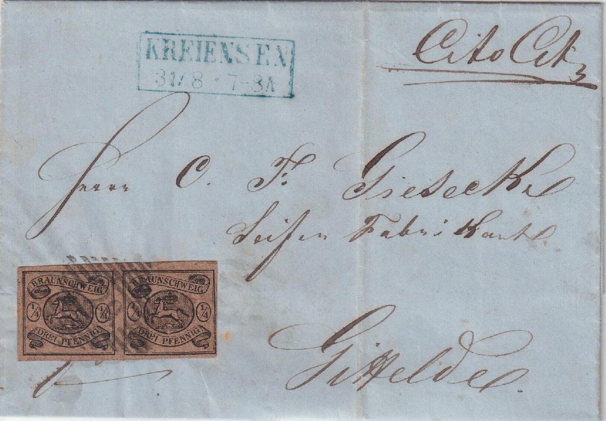 | Zusatzinformationen und Suchstichworte: | Südphila P. Feuser 101. Auktion 16. März 2024 Los 103 Altdeutschland Braunschweig M1/4 Ggr. a. braun, voll- bis breitrandiges Luxuspaar mit Stempel "29" Kreiensen auf Brief "cito,cito" nach Gittelde Ausruf 400,00 EUR |