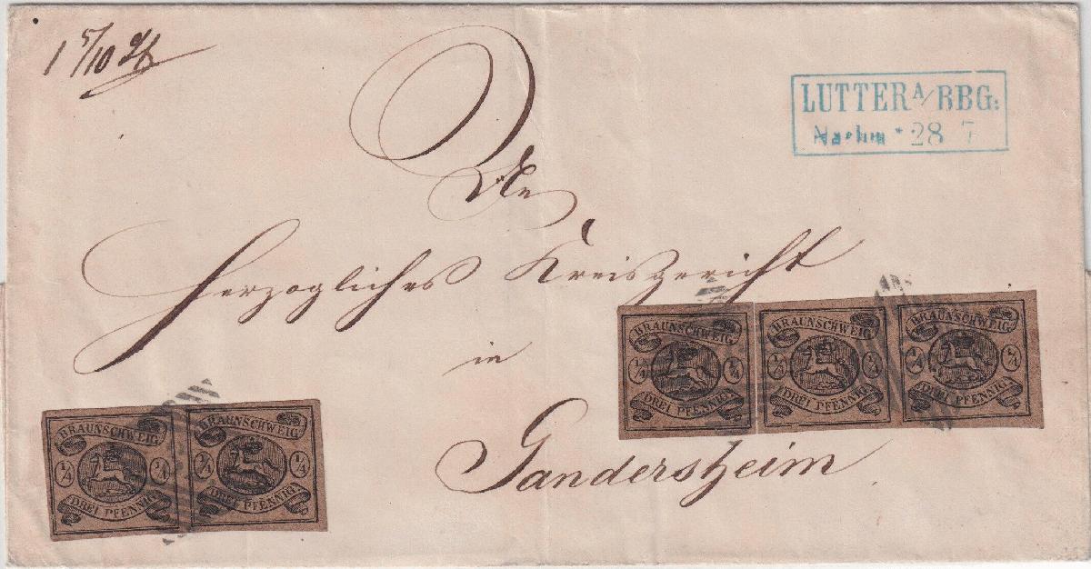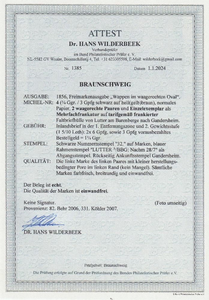 | Zusatzinformationen und Suchstichworte: | Südphila P. Feuser 101. Auktion 16. März 2024 Los 107 Altdeutschland Braunschweig 1/4 Ggr. a. braun, zwei breitrandige Paare und ein Einzelstück mit Stempeln "32" Lutter a.B. auf Luxus-Doppelbrief (inklusive Bestellgeld) nach Gandersheim, eine seltene und schöne Frankatur Ausruf 2.000,00 EUR |