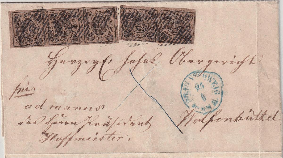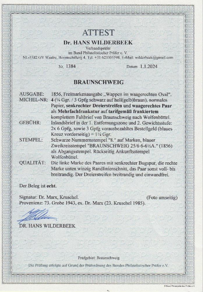 | Zusatzinformationen und Suchstichworte: | Südphila P. Feuser 101. Auktion 16. März 2024 Los 108 Altdeutschland Braunschweig 1/4 Ggr. a. braun, senkr. Dreierstreifen und rechts unten min. berührtes Paar (eine Marke Bugspur) auf dekorativem Doppelbrief (Falte) mit Stempel "8" Braunschweig nach Wolfenbüttel, zum Porto von 12 Pfg. wurden noch 3 Pfg. für die Zustellung frankiert Ausruf 1.200,00 EUR |