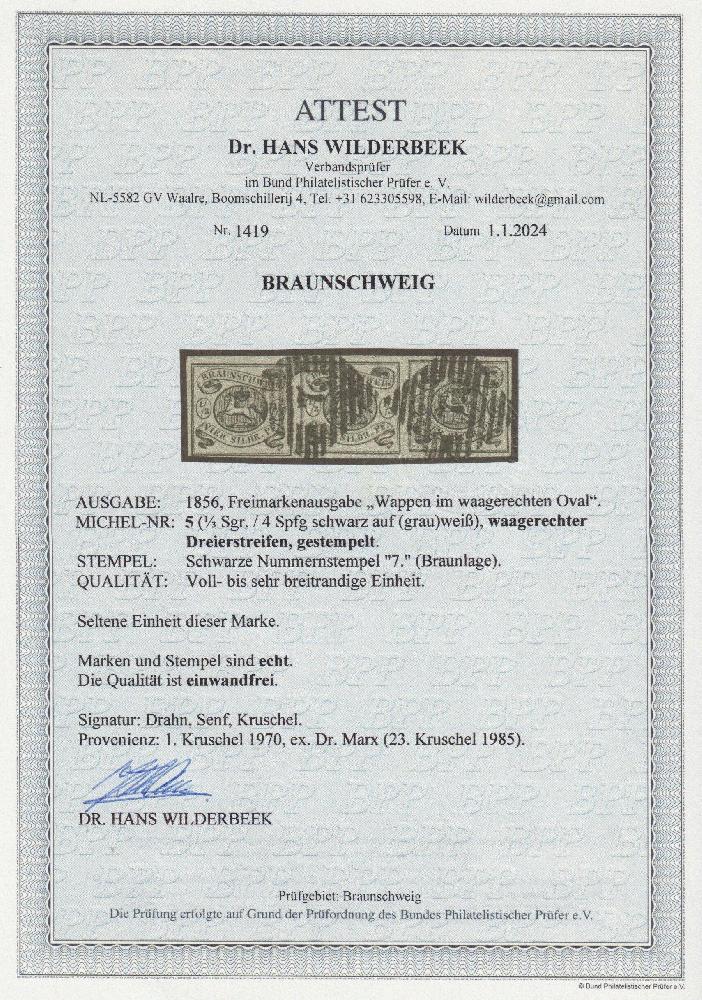 | Zusatzinformationen und Suchstichworte: | Südphila P. Feuser 101. Auktion 16. März 2024 Los 112 Altdeutschland Braunschweig 1/3 Sgr. schwarz, voll- bis breitrandiger Luxus-Dreierstreifen mit klaren Stempeln "7" Braunlage Ausruf 1.500,00 EUR |