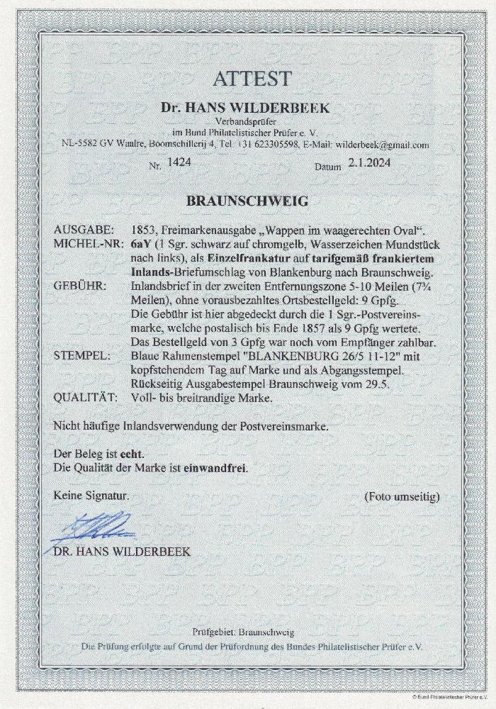 | Zusatzinformationen und Suchstichworte: | Südphila P. Feuser 101. Auktion 16. März 2024 Los 118 Altdeutschland Braunschweig 1 Sgr. a. chromgelb, Kabinettstücke mit R2 BLANKENBURG auf Damencouvert nach Braunschweig, seltene Verwendung der Postvereinsmarke im Inland Ausruf 200,00 EUR |