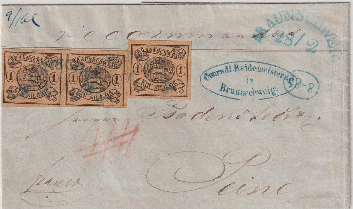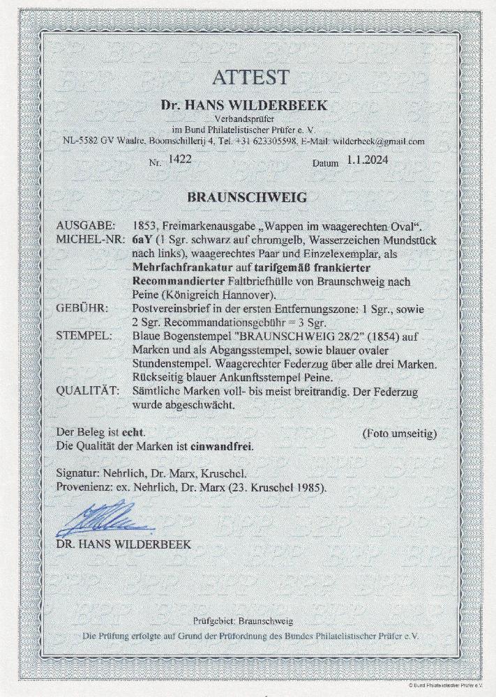 | Zusatzinformationen und Suchstichworte: | Südphila P. Feuser 101. Auktion 16. März 2024 Los 120 Altdeutschland Braunschweig 1 Sgr. a. sämisch, je breitrandiges Paar und Einzelstück mit Bogenstempel BRAUNSCHWEIG auf dekorativem Chargébrief (mit Rötelgitter, Federzug abgeschwächt) nach Peine Ausruf 200,00 EUR |