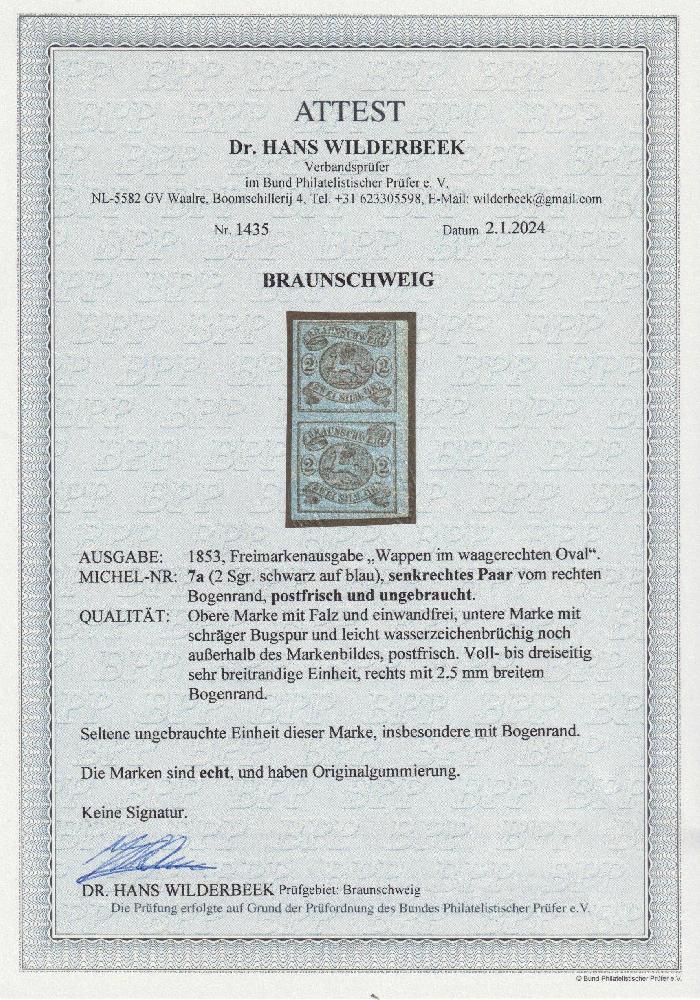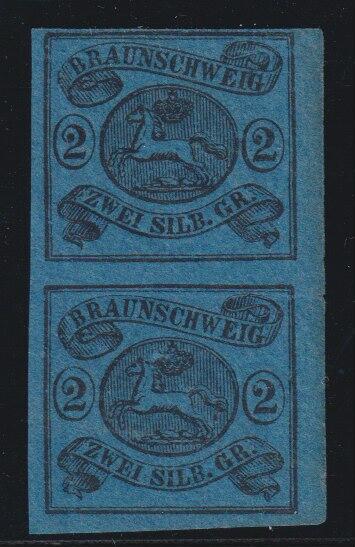 | Zusatzinformationen und Suchstichworte: | Südphila P. Feuser 101. Auktion 16. März 2024 Los 141 Altdeutschland Braunschweig 2 Sgr. a. blau, allseits sehr breitrandiges ungebr. senkr. Paar (untere Marke postfrisch, kl. Bugspur) Ausruf 400,00 EUR |
