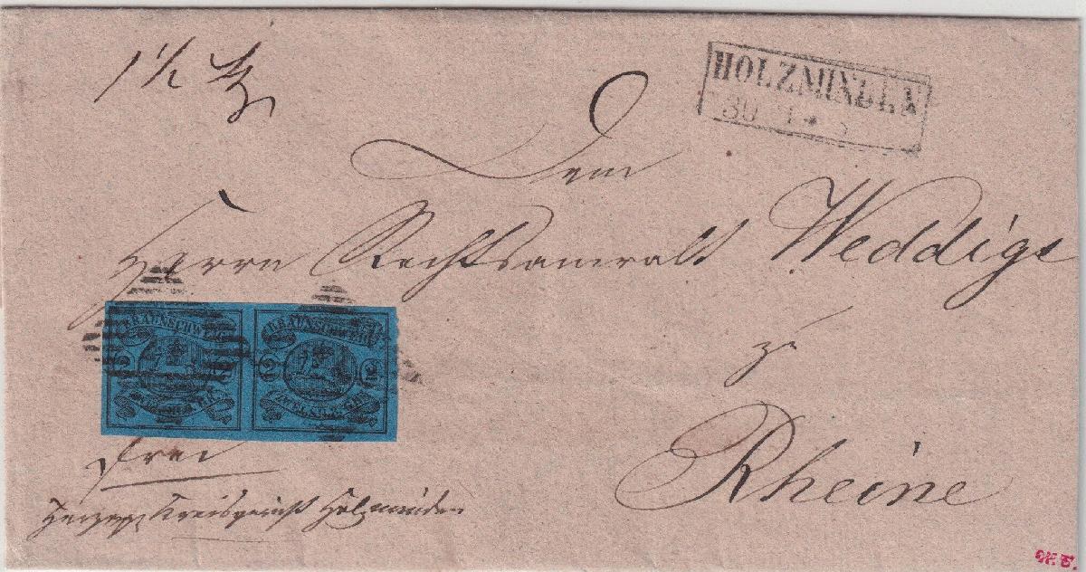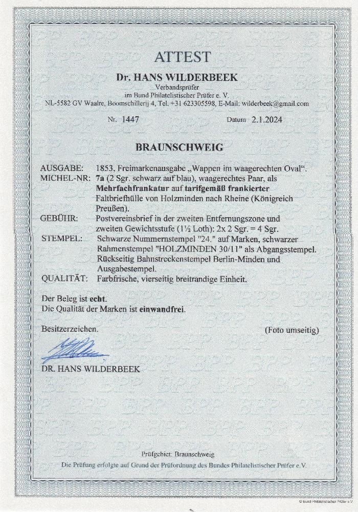| Zusatzinformationen und Suchstichworte: | Südphila P. Feuser 101. Auktion 16. März 2024 Los 146 Altdeutschland Braunschweig 2 Sgr. a. blau, breitrandiges waagerechtes Luxuspaar mit klarem Stempel "21" Holzminden auf schönem Doppelbrief nach Rheine, eine seltene Frankatur Ausruf 400,00 EUR |