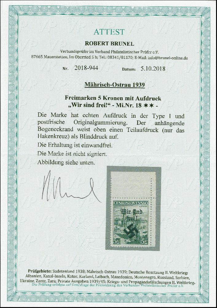 | Zusatzinformationen und Suchstichworte: | 383. Auktion Heinrich Köhler 14.–15. & 18.–23. März 2024 Los 3013 Böhmen und Mähren Mährisch-Ostrau 5 Kc. aus der rechten oberen Bogenecke mit Teilaufdruck im Blinddruck im Oberrand, postfrisch, tadellos, selten Ausruf 200,00 EUR |