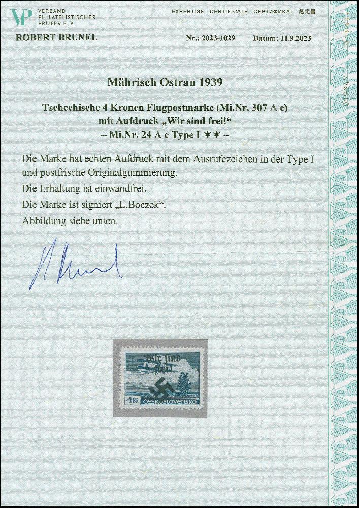| Zusatzinformationen und Suchstichworte: | 383. Auktion Heinrich Köhler 14.–15. & 18.–23. März 2024 Los 3014 Böhmen und Mähren Mährisch-Ostrau Flugpost 4Kc. graublau, Aufdrucktype I, postfrisch, tadellos Ausruf 220,00 EUR |